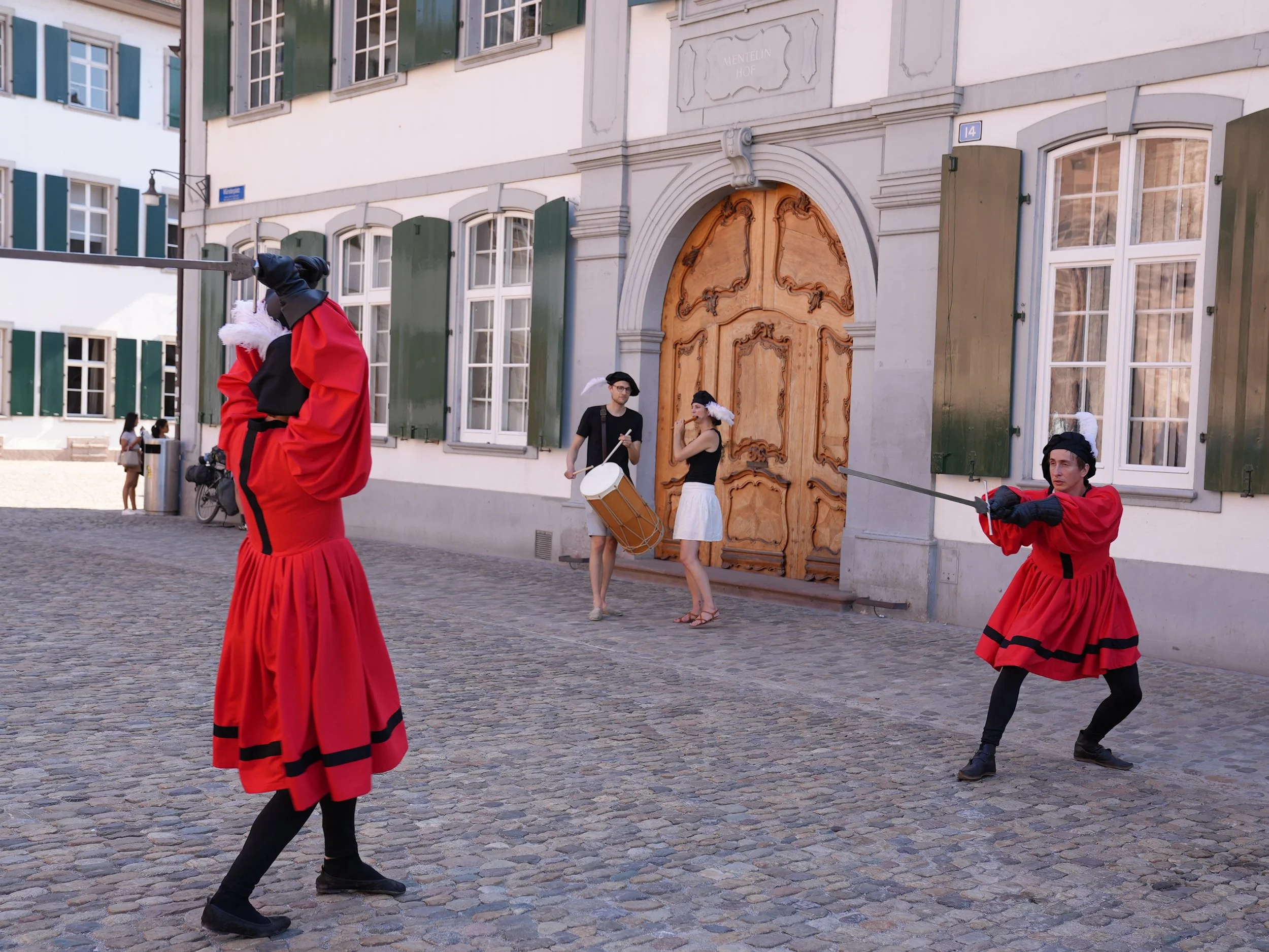 A musical montage with historical fencers on Basel’s Barfüsserplatz at the 2023 ReRenaissance Festival